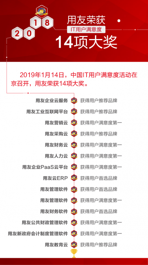 2019年1月14日,中国IT用户满意度大会在京举行,用友荣获14项大奖。本次活动由中国质量协会用户工作委员会和工信部电子科学技术情报研究所指导,国内权威ICT研究咨询机构计世资讯(CCW Research)主办,会上发布最具权威性和影响力的用户满意度调研结果。